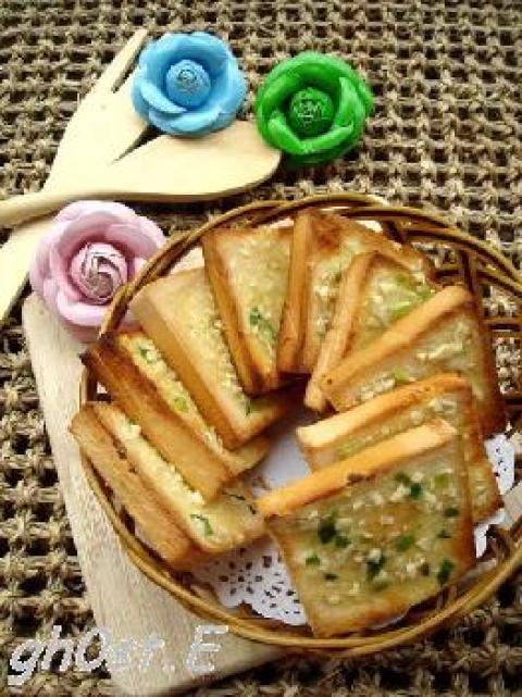 4.将调和后的蒜泥均匀抹在面包上,预热烤箱,200度烤4~5分钟。