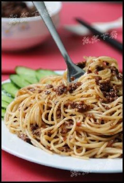 别看底下油汪汪的,上面的是用来夹馒头,填碗包,下面的我是用来拌面的,油一点都不多, 炒酱嘛本来就是要多点油,拌面条是还可以再加点麻油,今天拌意面就加了少许橄榄油。