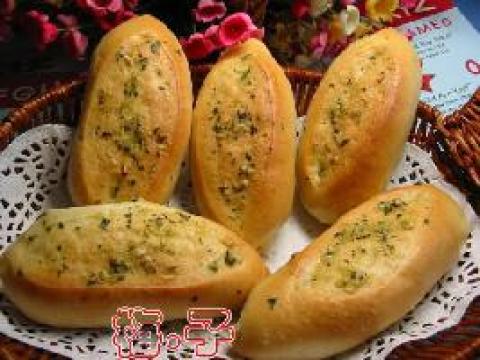 4.出炉时趁热把蒜泥奶油涂在上面.蒜泥奶油做法:用含盐奶油(放到室温)和蒜泥/九层塔(或香菜碎)拌匀就可以了. 蒜蓉的香味就跟面包房里的蒜香包一样哦!