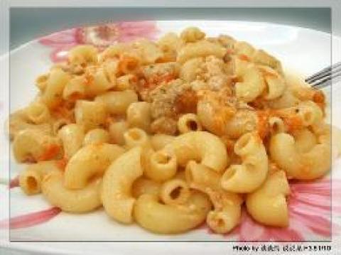 2.起镬放肉碎茄汁煮成肉酱,盛起铺在意粉上,再将芝士刨碎在肉酱上,用微波炉烧烤档加热8分钟即可.