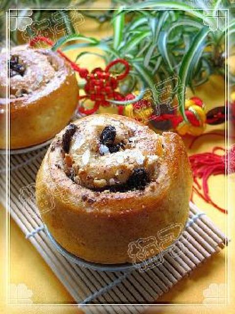 4.撒上葡萄干和核桃.再加肉桂粉.卷起.切成七八段.放入蛋挞模上进行第二次发酵.(如果有上下一样大的模子更好)刷蛋液.撒上碎冰糖.190度烤十二到十五分钟左右.