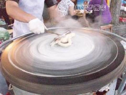 1.煎饼从鏊子上揭下,很柔软,冷却后变脆。放在盖帘上,要立即卷成卷。