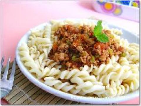 意大利面条, prego意大利酱,black pepper, tomato(切粒粒),肉碎,罐头菇(切薄片),洋葱(切碎),蒜头(切碎)~