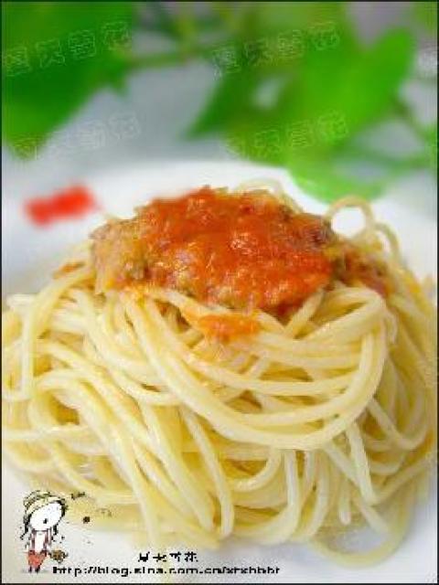 绞肉100克、大蒜末2颗、蘑菇切片5颗、蕃茄蔬菜面酱2杯、葱花少许、水1/4杯、意大利面200克