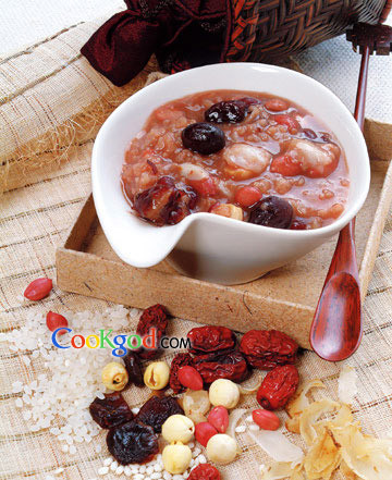 大米150克、百合50克、红豆100克、花生100克、桂圆肉50克、核桃仁50克、白扁豆50克、红枣100克、莲子50克、清水1000克。调料:冰糖100克。