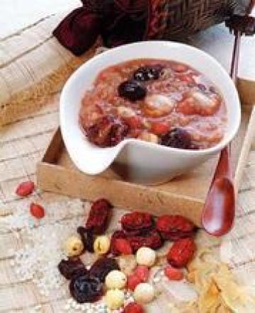 大米150克、百合50克、红豆100克、花生100克、桂圆肉50克、核桃仁50克、白扁豆50克、红枣100克、莲子50克、清水1000克。调料:冰糖100克。