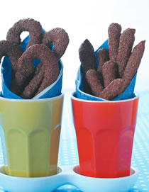 3.将面煳装入挤花袋中,再把面煳挤成柺杖形状或长条形状,放在舖有烤盘纸的烤盘上,放入烤箱以上火120℃、下火120℃烤约25分钟。