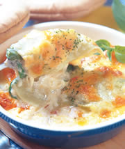 6.将剩余白酱淋在叠好的千层面上,洒满起司丝,放入220℃烤箱烤约5分钟后取出,洒上巴西里碎即可。