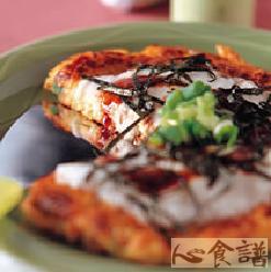 面煳:100g,材料:1/2小匙,盐少许,高丽菜丝70g,草虾3尾,蛋1个,红姜丝15g,黄金珠适量,青葱末1大匙,山药泥100g,蛋白1/2个,青葱末少许,海苔丝少许,煎饼酱汁适量