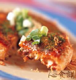 7.翻面继续焖煎至表面上色酥脆后盛起,涂上煎饼酱汁,再加上美乃滋、红姜丝、青葱末即完成。