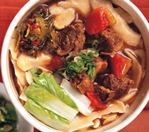 4.将作法3的汤与料加入刀削面碗中,并加入汆烫过的小白菜、酸菜,撒上葱花即可。