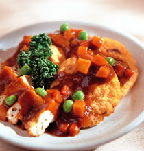 5.另起一锅,将其余的洋葱及胡萝卜下锅略炒后,加入市售咖哩块及水烧至咖哩块完全融化时,起锅淋至作法4的豆腐饼上即可。
