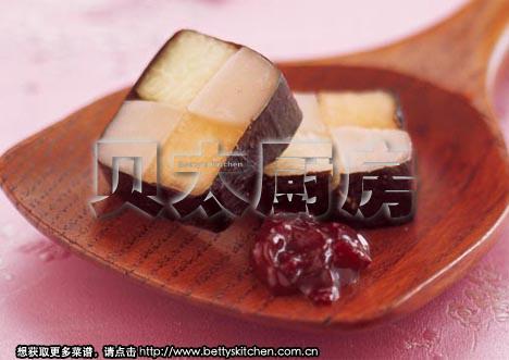 宁波年糕(长条状年糕)200g,烤紫菜 2片,哈蜜瓜(黄瓤)160g,哈蜜瓜(绿瓤)160g,樱桃果酱20g