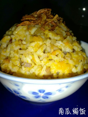 大米2杯370g,清水550ml,南瓜1/4个,咸肉粒2/3杯,虾米1/4杯,小红葱1粒,炸葱酥适量
