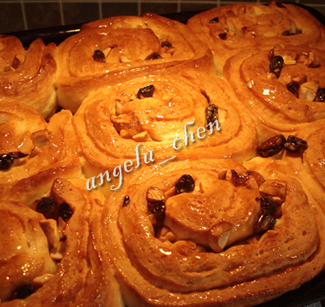 把剩下的一半黄油和糖(12克)左右融化后刷在面饼上。四边留出1厘米不刷。把面饼折叠,然后再次擀成同等大小的面饼。均匀的扑上干果,坚果和12克的糖。卷成卷后切成12块。分别放入刷好油的烤盘里。彼此间留一定距离。上面盖刷油的保鲜膜。再次发酵15-20分钟。