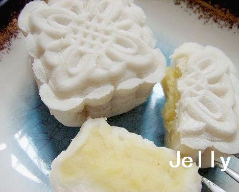 冰了一晚上的冰皮月饼,切一小块先尝尝吧,有一骨淡淡的奶香味,口感有点qq的,虽然是糯米粉为主料,但不会有那种糊嘴的感觉了,真的不亚于买的那种口感。