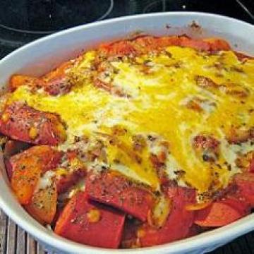 2.快火下油(约1汤匙)起锅,爆香蒜茸,加洋葱和1茶匙盐炒软;加香肠炒香及炒熟,加入蕃茄炒香,再加入汁料炒匀,汁开后淋于意大利面上,再洒上芝士,放入烤炉用约摄氏200度烤至芝士金黄,洒上香草即成。