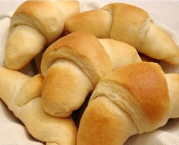 揉好的面团放到大盆里,用干布盖上放到温暖的地方,或是放到烤箱里,把烤箱灯打开。等上1个小时,或是等到面团是原来的两倍大时,取出来分成两份。每份用擀面棒擀成12英寸大概30厘米的圆形,抹上黄油,然后切成8份。取一份从圆周处往圆心处慢慢卷成卷,把两个角弯一弯就做成了羊角形的。可以把另一半面团做成其他形状,(可以参看第一次做的花式面包)这次我做成了球型的。把另一半面团均匀的分成8份,取其中一份揉成圆形,然后两只手从上往下把面团往里卷,转个90度继续卷,直到成为一个圆球型。其实应该分成9份,这样放到方形烤盘里就刚好。