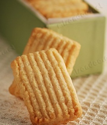 5) 用cookie press 把面团压成长条,切块,摆放好,中间留距离。325f烤25分钟。
