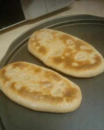 2.拿出面团稍微压扁拿成团,放一个盆里,盖上打湿扭干的paper tower,二次发酵了~20分钟。同时预热烤箱500f。二次发酵好后面团扯一个个拳头大小的面团,擀平大概2mm厚,椭圆形啥的。我没有pizza stone,就用烤盘,把馕仍烤盘上,500f 三分钟,然后反面不到一分钟。就好了。