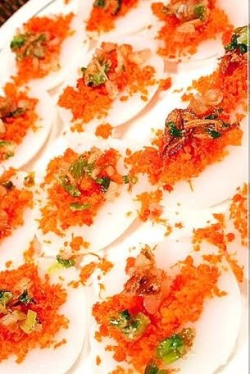制法:特选粘米粉200g,水磨粘米粉100g,温水三杯半之比率融化拌好(就成茨粉,两种不冈的粘米粉相拌增加韧性与口感)边置一小时待用.虾米先用温水浸15分钟沥干水用搅拌机打碎成虾末,热干锅,放干虾末进去干炒加点食品红色水炒至午燥备用.制法:热油锅,爆香葱花与红葱头备用.大火煮滚一锅开水,小酱碟隔水置于蒸笼之中加热后,搞匀茨粉倒三分之一勺茨粉于小酱碟之内蓋蓋蒸7分钟拿出置于冰水之上,再用条匙取出米饼摆于大碟之中,吃时放些炒过的虾末与炸葱油,配鱼露即可开吃.
