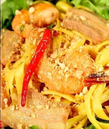 制作:煮一锅热水滚后放一匙黃姜粉(黃姜粉拌碎花生与薯片有畫龙点睛之妙),两大匙油再放意面进去煮熟再过冷河备用.洗好的带壳虾与五花肉切片,热油锅爆香蒜茸,放五花肉片进去炒香,放四分一匙黃姜粉,鱼露,一碗半水,盐,糖,味精调味后转小火焖大约二十分钟,放进虾蓋好蓋子熄火即可.摆各类香菜,生菜与荳芽于空碗底,放黃面条,放些五花肉与虾,倒三匙肉汁,放点碎花生与薯片即可进食,吃时可随意再加些青柠汁,香与生莱,鱼露等.