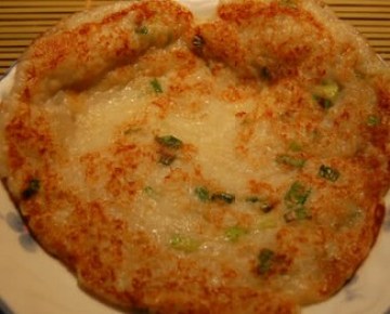 2、平底锅加油,微热时,用筷子拨些菜糊进去,调整成圆饼状,小火慢煎至两面黄色。