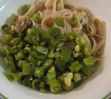 葱花、扁豆、肉末(放的比较少,家里没pork了,应该再多些)、半个辣青椒(忘记了放鸡蛋,最好加一个)
