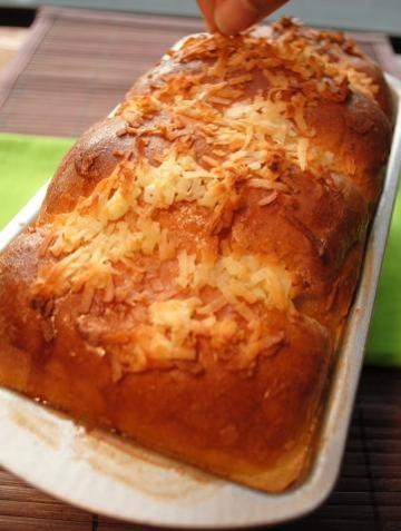 8、烤箱预热340°f,烤20分钟后,在表面刷上由鸡蛋、椰丝、黄油混合而成的椰蓉酱,继续烤20分钟出炉!