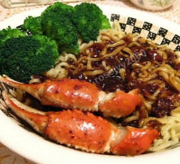 然后另开锅,将调好的酱汁煮至起泡,起泡就表示熟了。浇在面上,放上炒好的椒盐蟹,哈哈,说不出的香。