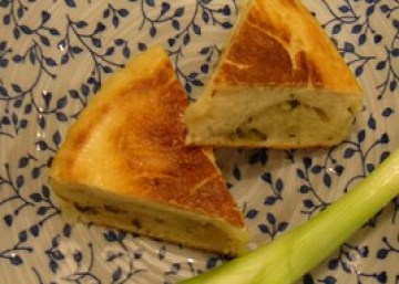 把面团揉开成长条,抹上油,撒上一点盐(自发面已经有盐),铺上葱花(绿的部分,白的太硬会刺破面皮),卷成长条筒,再盘起来,压扁,放进不粘的锅,加油和水,盖上盖,小火焖煎到两面金黄