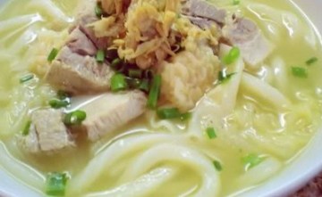 鲜乌冬面用开水煮过放碗里, 放入肉片, 倒入肉汤和菜, 加冬菜末(洗净,切碎), 葱花,