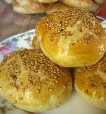 b. 具体操作 : 先将外皮剂子按扁,用手捏开,包进去一个小油酥面团,形成一个小圆球,再用手按扁 , 用擀面棍擀成稍长的椭圆形 , 叠成三 层后 再擀 一次椭圆型 , 再擀成圆方型后 , 包进一勺糖粉 , 包紧成一个小圆球 , 用手按扁并拍打压按成手掌型(椭圆型),也可用小擀面稍擀一下成手掌型,(但擀时要小心,用力不均会漏糖馅的,最后摆盘,刷层蛋黄 , 撒些芝麻 , 以次做好八个饼为第一盘 .