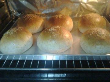 7. 一个钟头后, 把发酵成2.5倍大的面团取出, 涂搽一层水, 撒上芝麻(随意)。再把烤盘放入预热至180度c的烤箱内烤12分钟。