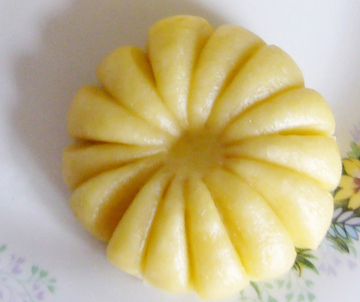 3、做型:在面团中兑入一点碱水揉匀,再加入一点泡打粉揉匀。切成剂子,流圆压扁,切出花瓣,疏密看自己喜欢。室温发酵45分钟;