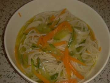 黄瓜1根、胡萝卜1根、葱、食用调和油、热水、面条、盐、醋。