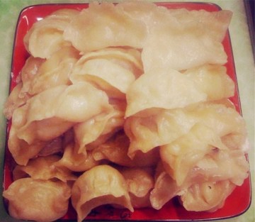 5 面团分成均匀大小的面剂,擀成皮,然后把馅料包入,饺子皮要比普通的水饺大一倍,就是要大一些,才好吃
