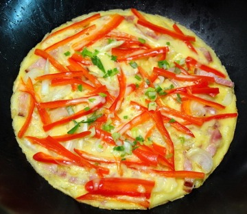 5、大概40秒以后,把火关掉,在蛋糊面上轻轻铺上青红椒丝、小洋葱丝、培根丝、葱段,最后铺上切好的干酪丝。