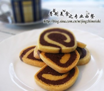5.面团分两半。其中一半是原色面团,可以加些香草精华调些香味。没有的话可以不加。另一半加些巧克力酱(用少许热开水溶化30克巧克力粉,使之成为糊状)。这样,两种颜色的面团就做好了。入冰箱冷藏30分钟
