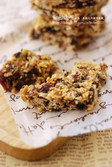 熟燕麦片100克,全麦粉60克,杏仁片50克,葡萄干30克,蔓越莓30克,樱桃干20克,黑加仑干30克,蜂蜜100毫升,香草精1茶匙,蜂蜜15毫升,水15毫升