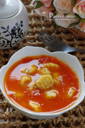 7. 炒出番茄汁,加入汤,搅匀,煮一分钟;