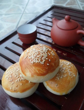 4.将每一个小面皮包入馅料与葱花(放在馅料上),收口捏紧,收口处刷蛋水、沾白芝麻,朝下放在烤盘上;再在圆形表面刷上麦芽糖水,以上下火各220℃烘烤20∼25分钟即可(待饼皮表面着色后先将上火关掉)。