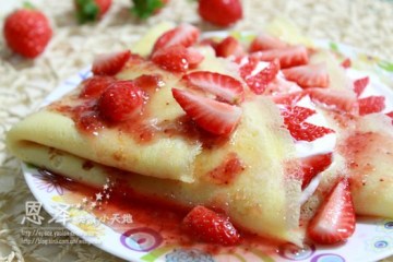 4:平底锅中小火加热,将蛋饼糊倒入,晃动锅摊成厚度均匀的蛋饼并两面煎黄,吃前淋入草莓汁、放入适量鲜草莓片即可。