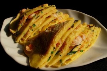 2、平底锅刷油,撒入葱丝,入面糊,入虾肉,再撒些葱丝,两面煎黄即可。