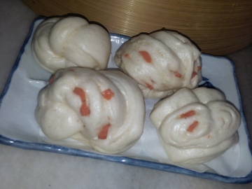 3. 把水烧开后, 上笼用小火蒸10分钟让馒头定型, 然后把蒸笼离锅, 打开盖子让热气及水汽散一散2分钟,这时的馒头是半熟的,所以表面颜色暗淡。 然后再上锅用中大火蒸5~8分钟, 至馒头表面光亮即可。用这两次蒸法可以避免馒头皱皮的现象,效果比较稳定!