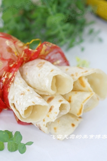 2,做好的荷叶饼可以用来做各种卷饼。放上不同的馅料,非常好吃。