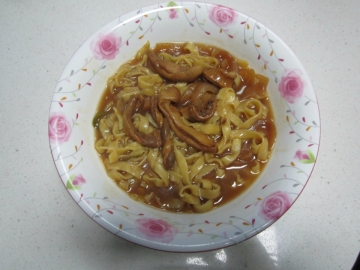 3、熟猪肚切条,加面条酱油和芝麻油浇在面条上。