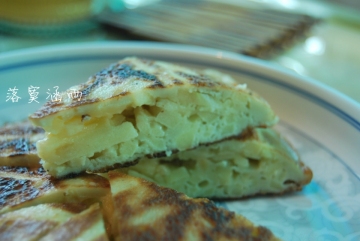 3、平底锅抹上一层薄薄的油(用纸巾涂抹更均匀),倒入一大匙步骤(2)做好的蛋糊,以中小火徐徐加熱至蛋糊表面冒出气泡或者看到边边有点翘起来,铲子可以顺利铲起饼边就好,把饼翻过来略煎一下就可以了(这个过程是需要点耐性的)。煎好的饼皮应该一面是咖啡色,一面是米黄色的。