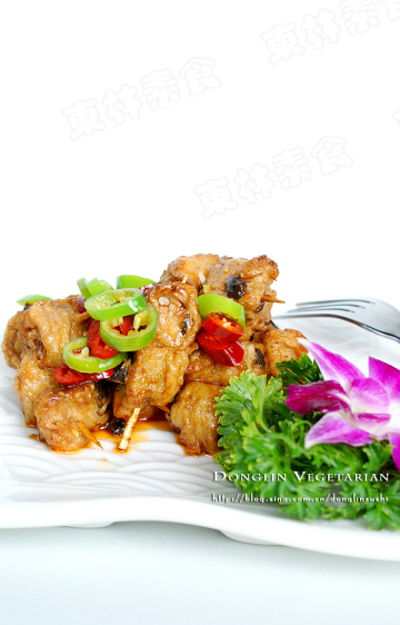 5. 起锅,锅内加少许油,煸香豆豉,放入牙签面筋、少许生抽、糖、素易鲜调味,最后放入青红椒圈,淋少许香油、辣油,出锅装盘即可。