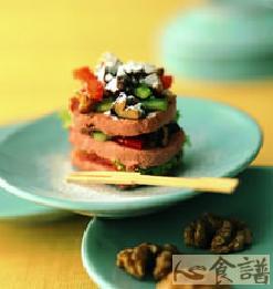 (3)以叠放的方式,依照松茸鹅肝、生菜、青椒丝、红甜椒丝、核桃仁的顺序叠起,最后再撒上糖粉即完成。